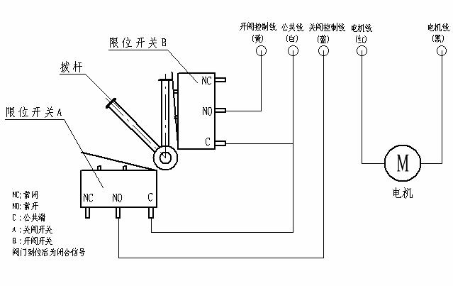 4)執(zhí)行機構(gòu)引出線中:紅色線為電機正極引出線,黑色線為電機負(fù)極引出線,黃色線為開閥到位引出線,藍(lán)色線為關(guān)閥到位引出線,白色線為閥到位公共線。