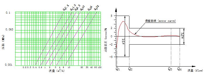 壓力損失曲線 Pressure loss curve                                                    示值誤差限與流量曲線FLOW-ERROR CURVE