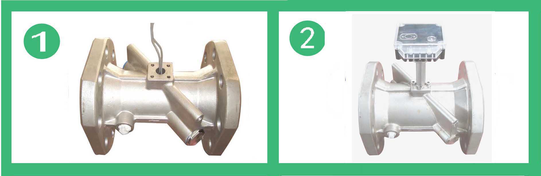 b.樓棟型熱量表超聲波流量計(jì)由表殼、換能器、換能器座組成。順流方向和逆流方向,換能器1或換能器2發(fā)射的超聲波信號(hào)由換能器2或換能器1接收。