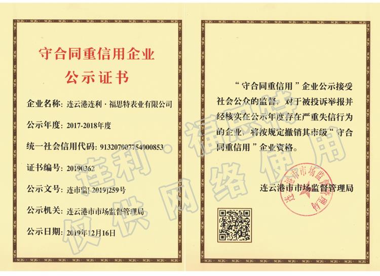 近期,連云港市市場監(jiān)督管理局公布了2017-2018年度連云港市“守合同重信用”企業(yè)名單,連云港連利·福思特表業(yè)有限公司名列其中,公司獲得“守合同重信用企業(yè)”榮譽(yù),這是公司連續(xù)第三次獲得該榮譽(yù)。據(jù)悉,市級“守合同重信用”企業(yè)是由15個(gè)市級機(jī)關(guān)組成的市級“守合同重信用”企業(yè)評審委員會評審。